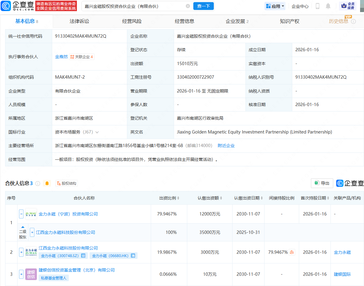 近日,嘉兴金磁股权投资结伴企业(有限结伴)成就,出资额约1.5亿元股票配资交易网,盘算推算限制包含:股权投资。企查查股权穿透线路,该结伴企业由金力永磁(300748)偏激旗下金力永磁(宁波)投资有限公司、建银创信投资基金贬责(北京)有限公司共同捏股。