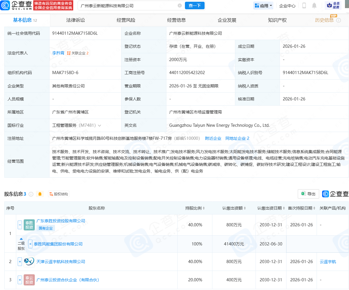 近日,广州泰云新动力科技有限公司栽植,法定代表东说念主为李矜霄,注册老本为2000万元,计较边界包含:发电时代行状;风力发电时代行状;太阳能发电时代行状;储能时代行状;电气开采销售等。企查查股权穿透袒露,该公司由泰胜风能(300129)全资子公司广东泰胜投资控股有限公司、天津云遥宇航科技有限公司等共同执股。