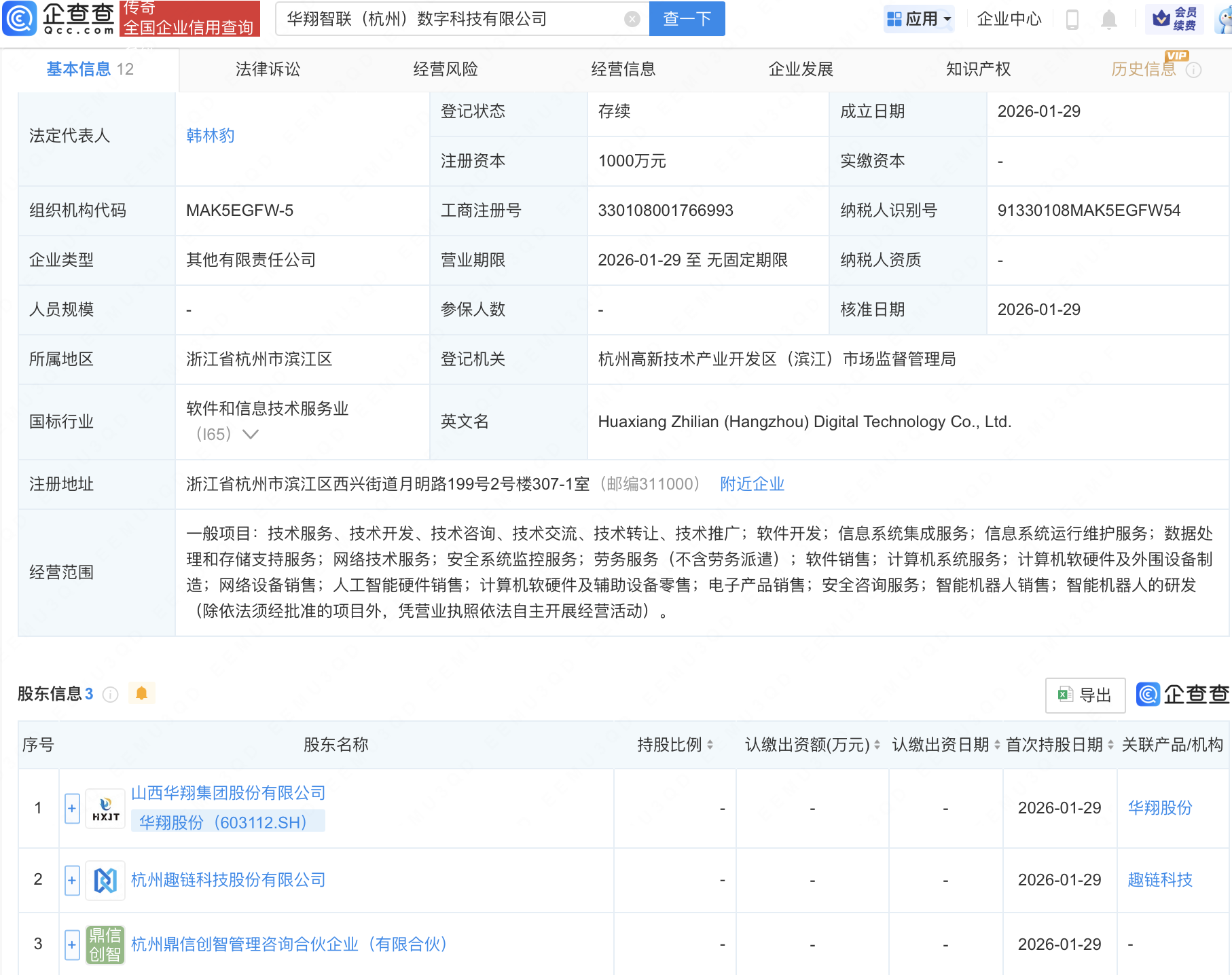 近日,华翔智联(杭州)数字科技有限公司建树,注册成本1000万元,打算鸿沟包含:收集开发销售;东谈主工智能硬件销售;计算机软硬件及补助开发零卖;电子居品销售等。企查查股权穿透知晓,该公司由华翔股份(603112)等共同捏股。