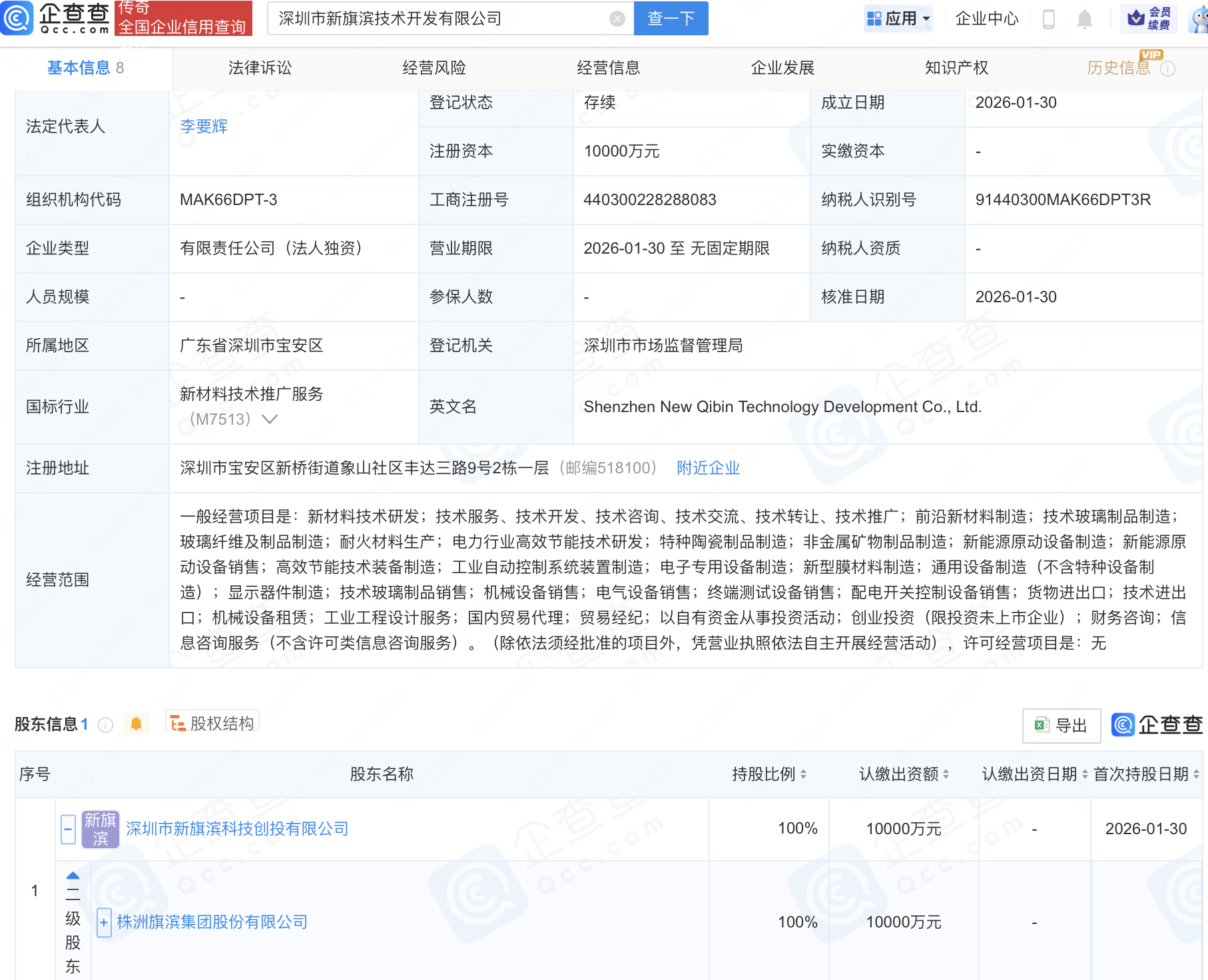 近日股票配资交易网,深圳市新旗滨时刻开发有限公司建筑,注册成本1亿元,研讨畛域包含:前沿新材料制造;新动力原动开拓制造;新动力原动开拓销售;高效节能时刻装备制造等。企查查股权穿清晰出,该公司由旗滨集团(601636)曲折全资捏股。