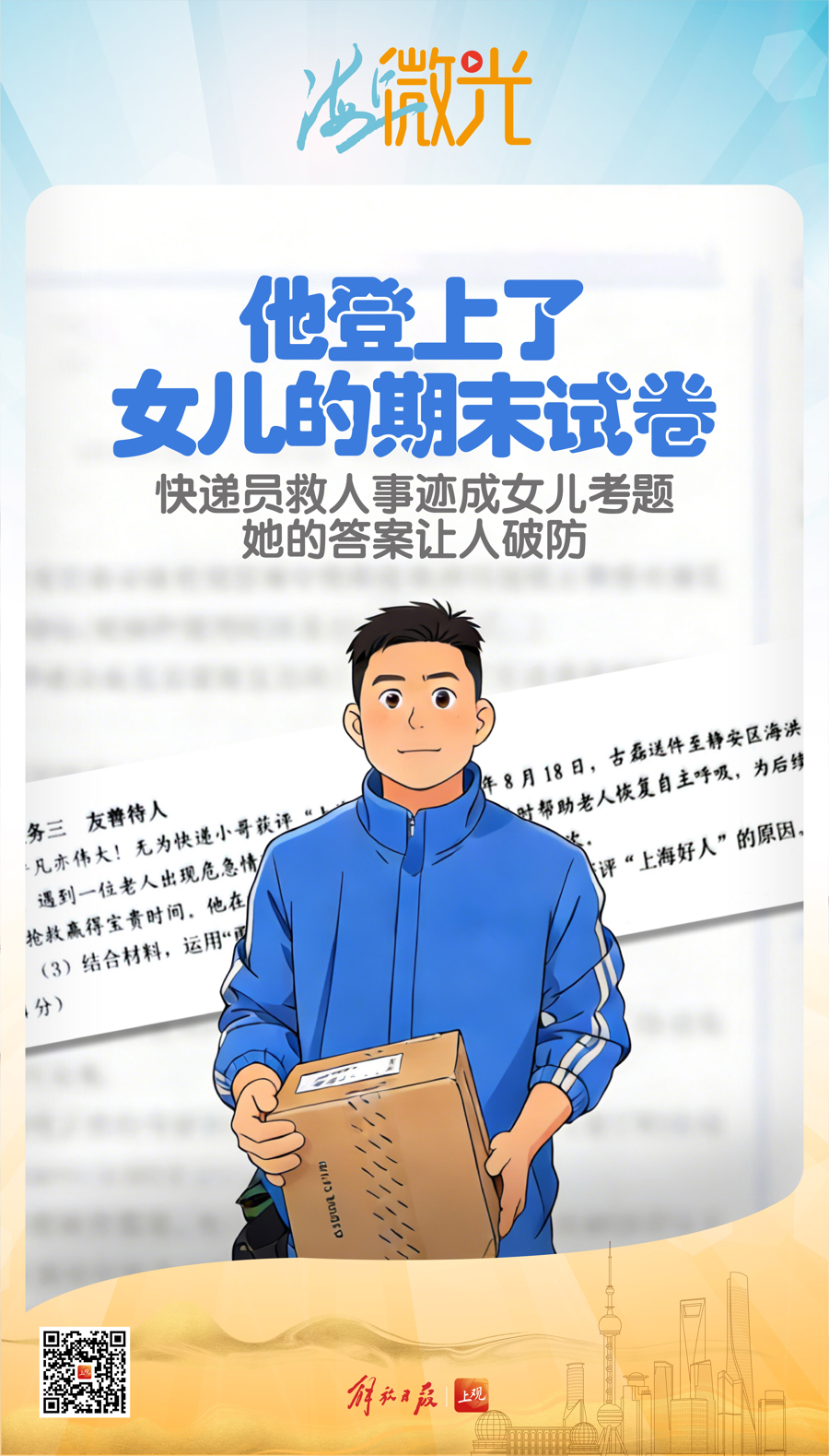 日前,上海中通静安四部快递员古磊不测得知,我方在2024年的一次义举,居然成了在芜湖普通市刘渡中学就读的男儿八年齿“说念德与法治”期末试题之一: